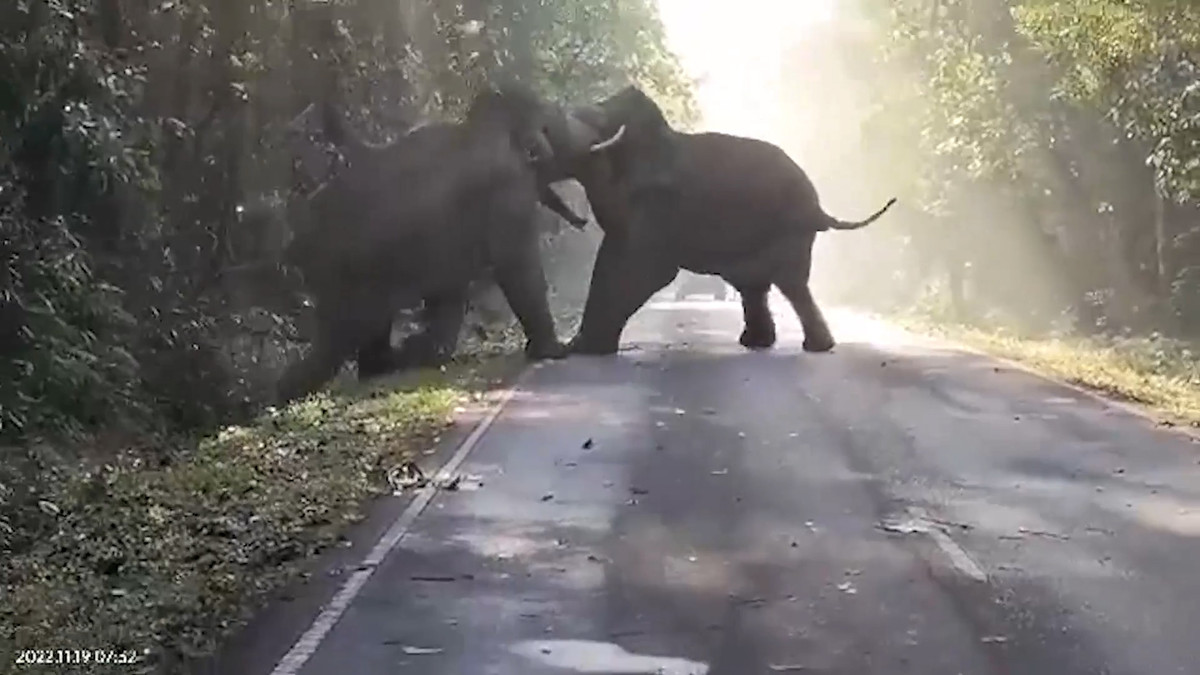 Hai con voi đực hung hãn đụng độ nhau trong mùa giao phối ở Thái Lan, cuộc chiến kéo dài 30 phút và lực lượng kiểm lâm phải can thiệp.