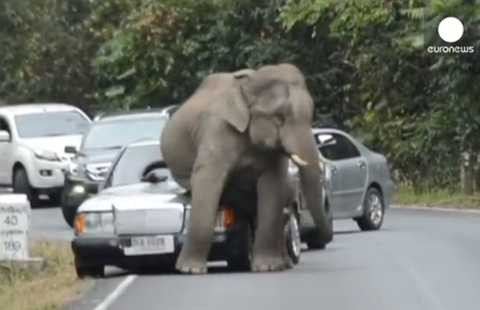 Đoạn phim được quay bởi một du khách đang trên đường vào vườn quốc gia Thái Lan, ghi lại cảnh một con voi băng qua đường và cọ chiếc mông của nó vào chiếc Mercedes-Benz.