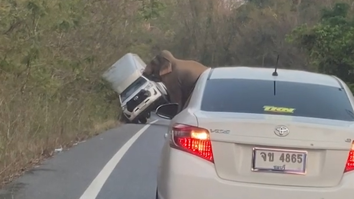 Một con voi hoang dã hung hãn chặn đầu xe và húc lật chiếc bán tải vào bụi rậm tại tỉnh Chachoengsao, Thái Lan.