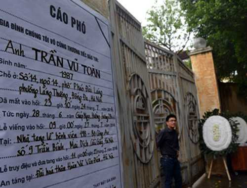 Cáo phó vừa được gia đình Trần Vũ Toàn dán lên trước cổng nhà tang lễ
