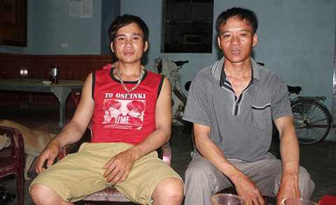 | Hai ngư dân đầu tiên phát hiện và huy động lực lượng, phương tiện trục vớt vật thể lên bờ. (bìa trái là anh Trần Ngọc Quân, bìa phải là anh Trần Ngọc Thắng). |