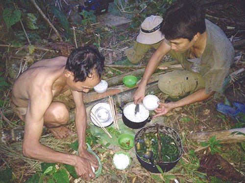 6h chiều, trời đã sập tối, không thể quay tiếp được nữa, chúng tôi quay về chòi. Bữa tối, sẵn có ít gạo, mấy anh em quyết định nấu cơm. Do trời tối, lại vội vàng nên cuối cùng nồi cơm bị sống. Thức ăn cũng chỉ có rau rừng luộc chấm muối. Thế nhưng, có lẽ vì mệt và đói nên ai cũng ăn ngon lành, thậm chí anh chàng quay phim Đức Cường thường ngày vẫn kén ăn mà nay cũng làm được… 3 bát.