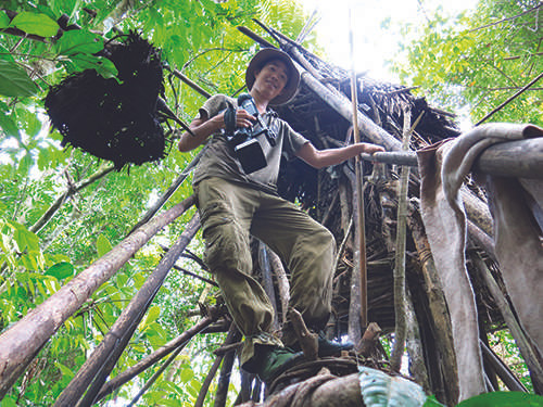 Lúc này cũng đã 1h chiều. Vừa đặt balô, máy móc xuống thì chúng tôi phát hiện chân ai cũng dính vài con vắt đang hút máu no nê. Để thực sự trải nghiệm cuộc sống của người rừng, chúng tôi quyết định tái hiện lại những sinh họat hàng ngày của cha con ông Thanh. Anh Lâm trở thành “diễn viên” bất đắc dĩ vào vai “người rừng” khi phải đóng khố, đeo gùi. Đúng như cách nấu cơm của cha con ông Thanh, anh Lâm cũng tự làm bùi nhùi và nhặt 2 hòn đá đánh lửa rồi đi xung quanh căn chòi hái lá rừng. Tôi và Cường đi kiếm củi. Bữa trưa của chúng tôi chỉ có mì tôm nấu với rau rừng. Ăn xong, chúng tôi đi quay luôn vì sợ trong rừng trời sẽ tắt nắng rất nhanh. Do đêm hôm trước mất điện không xạc được pin máy quay nên Đức Cường phải tác nghiệp trên tinh thần tiết kiệm triệt để.