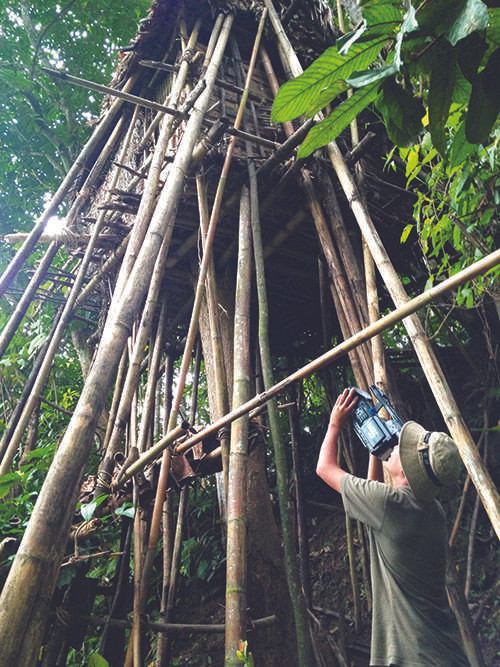 Chiếc cầu dẫn lên chòi làm bằng nhiều cây rừng được buộc chặt bằng những sợi dây mây. Trong căn chòi, chủ yếu là những chiếc ống lồ ô nhuộm đen màu khói tro dùng để chứa lương thực dự trữ. Cách đó gần 100m, cha con ông Thanh còn dựng một cái chòi lá khác cũng ở trên cây làm nơi cất trữ lương thực sau thu hoạch, và cũng là nơi ở dự phòng trong trường hợp nhà chính bị mưa, gió làm hỏng.