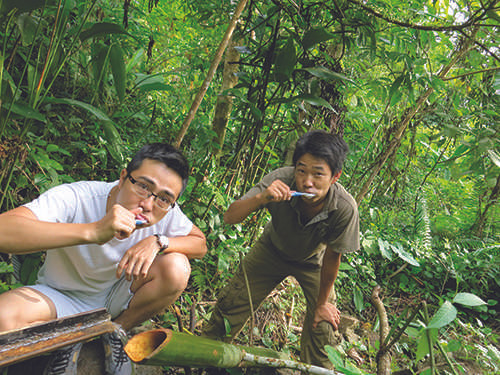 9h sáng, chúng tôi bắt đầu vào rừng. Nơi sinh sống của cha con ông Thanh là ngọn núi cao Apon, cách trung tâm huyện Tây Trà hơn chục km, để đến nơi phải đi bộ khoảng 4 tiếng đường rừng, vượt qua 2 quả núi. Có những đoạn không có bóng cây, lại đúng giữa trưa khiến mắt tôi cứ hoa lên, chân không thể bước nổi. Đồ lương thực chúng tôi mang vào rừng được tối giản hóa, chỉ có mì tôm, một ít gạo và bịch lương khô Mỹ - “bảo bối” sếp cho. Lần hiếm hoi trong đời, tôi quyết định bỏ qua khái niệm “ăn uống vệ sinh” để tận hưởng dòng nước suối mát ngọt và những trái cây dại ven đường có mùi vị rất lạ.