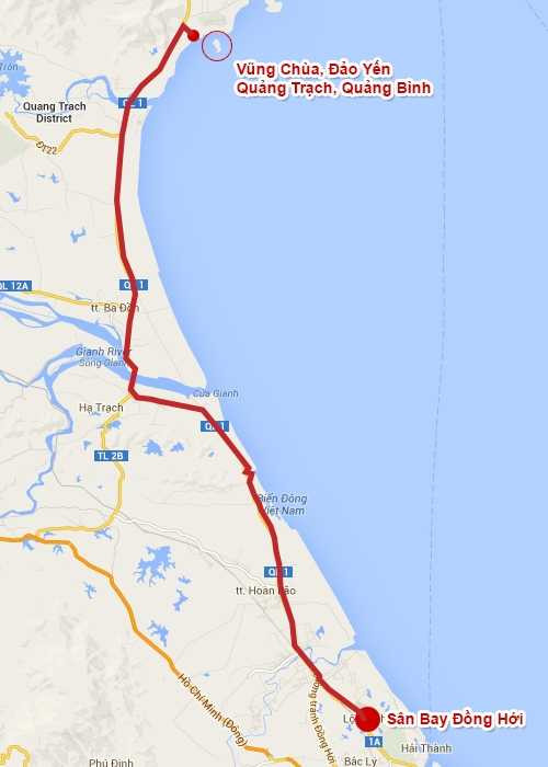 | Đường di chuyển linh cữu Đại tướng từ sân bay Đồng Hới về địa điểm an táng tại Vũng Chùa, Đảo Yến. |