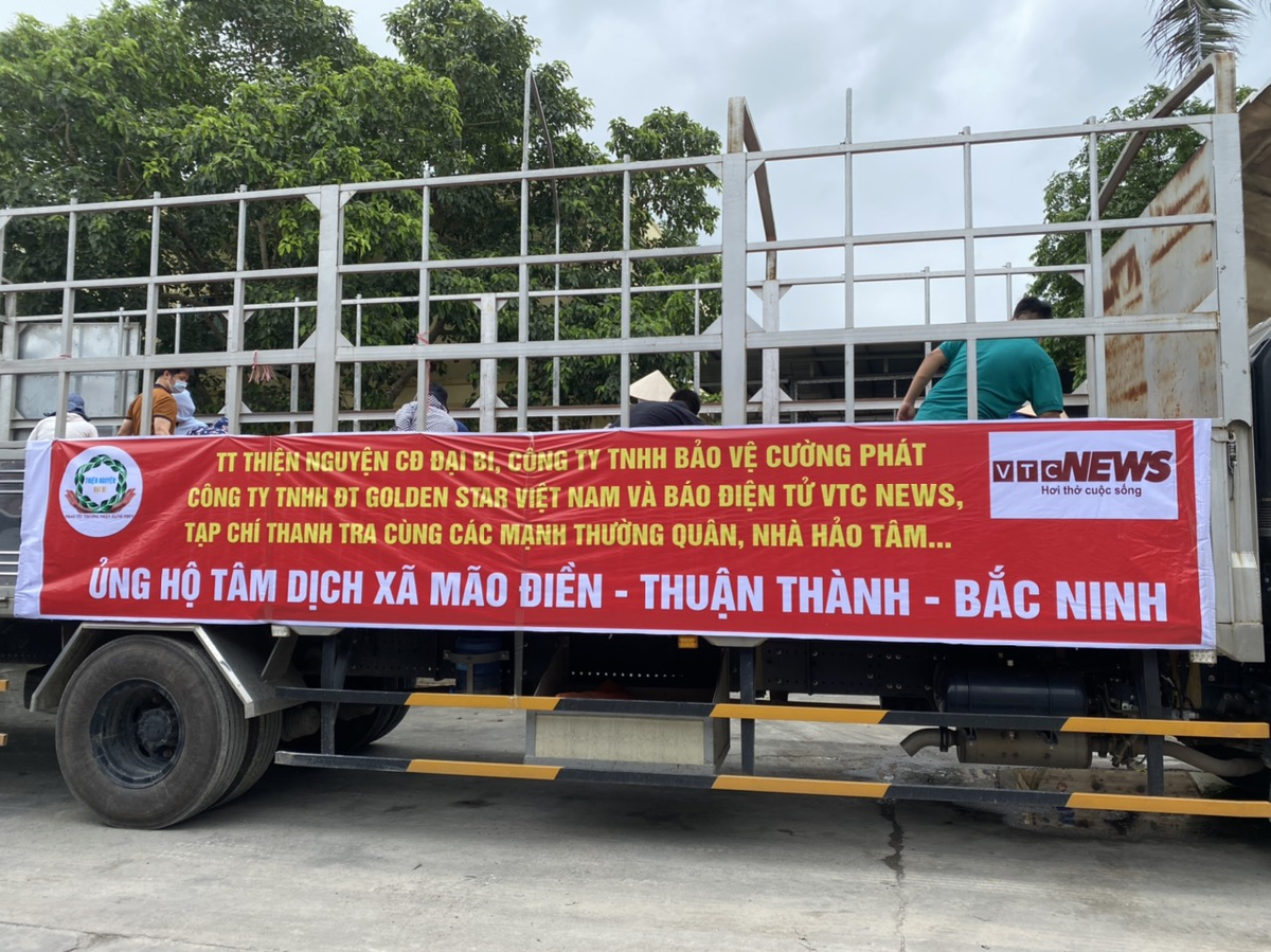 Tại tỉnh Bắc Ninh, Trung tâm thiện nguyện cộng đồng Đại Bi cùng Báo điện tử VTC News vận chuyển, trao tặng 10,5 tấn gạo cùng hơn 1.200kg giò lụa, 500 lọ muối vừng, hàng trăm thùng nước uống tăng lực…cho người dân vùng dịch Mão Điền, huyện Thuận Thành.
