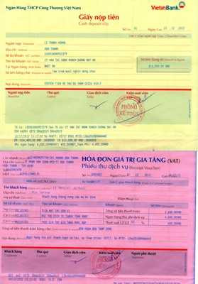 Phiếu nộp tiền mua hai vé tàu của anh Hoàng tại Ngân hàng VietinBank – chi nhánh Hòa Thành, Tây Ninh.