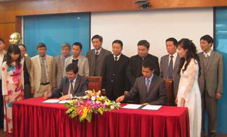 Ông Lê Văn Hợp, Vụ trưởng vụ thi đua - khen thưởng, Bộ Tài nguyên và Môi trường và Nguyễn Kim Trung, Phó giám đốc Đài truyền hình Kỹ thuật số VTC ký kết chương trình tăng cường truyền thông trong lĩnh vực môi trường