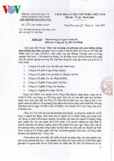 Mới đây, ngày 29/7/2015, Phòng Thương mại và Công nghiệp Việt Nam chi nhánh tại Vũng Tàu cũng đã có công văn đề nghị cho phép xuất nhập cảnh đối với ông Vũ Văn Đảo.