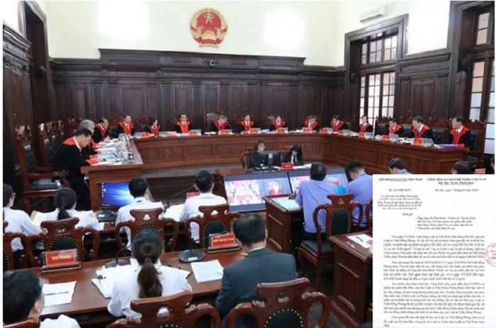 "Liên đoàn Luật sư Việt Nam chuyển đơn của luật sư Trần Hồng Phong đến Hội đồng Thẩm phán TAND Tối cao và chủ tọa phiên tòa để xem xét đề nghị của ông Phong được tham gia đầy đủ, được trình bày và tranh luận dân chủ, bình đẳng tại phiên xử cho đến khi kết thúc", Liên đoàn Luật sư cho hay.