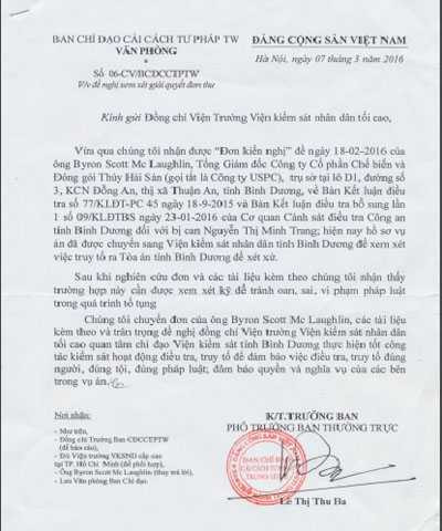 Về vụ việc này, Phó trưởng Ban Chỉ đạo cải cách Tư pháp Trung ương Lê Thị Thu Ba đã có văn bản và chuyển đơn của ông Byron, Tổng giám đốc Công ty Cổ phần Chế biến và đóng gói Thủy hải sản (Công ty USPC) - trụ sở tại KCN Đồng An, thị xã Thuận An, tỉnh Bình Dương - đến các cơ quan tư pháp Trung ương cùng các tài liệu kèm theo với yêu cầu thực hiện tốt công tác kiểm sát hoạt động điều tra, truy tố vụ án này để tránh oan sai, vi phạm pháp luật trong tố tụng, đảm bảo quyền và nghĩa vụ của các bên trong vụ án, bởi lẽ như đơn của ông Byron khẳng định: “Những cáo buộc từ phía Công an tỉnh Bình Dương về việc Công ty USPC và bà Minh Trang tham ô tài sản, lấy cắp 11.062 kg cá ngừ CO loin đông lạnh từ Công ty TNHH Xuất nhập khẩu Vinh Sâm và trốn thuế là vô căn cứ và là sự cáo buộc oan”.