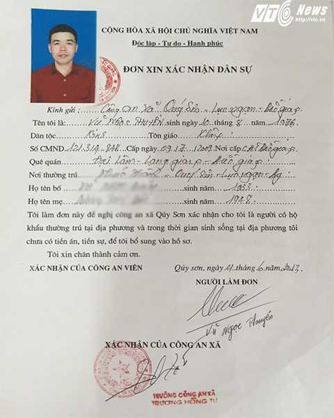 Kiểm tra hồ sơ, ông Nguyễn Văn Phương cho biết, trong hồ sơ lưu trữ còn có “Đơn xin xác nhận dân sự” của Vũ Ngọc Thuyển. Nội dung đơn (do Trưởng công an xã Quý Sơn Trương Hồng Tư ký, đóng dấu vào ngày 4/6/2013, tức 3 tháng sau ngày Thuyển bị khởi tố) ghi rõ: “Tôi làm đơn này đề nghị công an xã Quý Sơn xác nhận cho tôi là người có hộ khẩu thường trú tại địa phương và trong thời gian sinh sống tại địa phương, tôi chưa có tiền án, tiền sự để tôi bổ sung vào hộ sơ”.