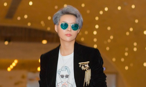 Điểm nhấn cho bộ vest màu đen là chiếc ghim cài Chanel trị giá 40 triệu đồng, phối cùng đôi giày Gucci và Dolce trị giá khoảng 30 triệu đồng cùng chiếc áo thun bên trong rất thanh lịch và đặc biệt khi in hình của chính nữ ca sĩ một cách rất độc đáo.