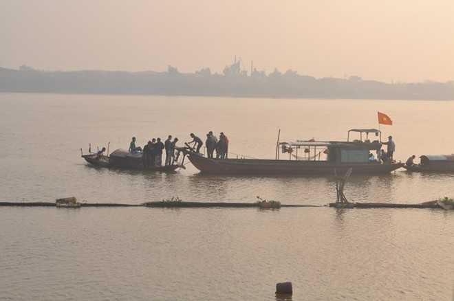 | Gia đình chị Huyền đang tìm kiếm trên sông Hồng. |