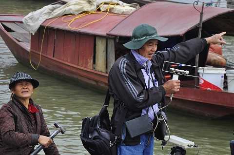 | Ông Quang đại diện gia đình chị Huyền cùng tiến sĩ Bằng tìm kiếm tại khu vực cầu Thanh Trì |