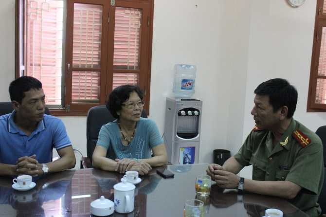 | Lãnh đạo công an huyện Gia Lâm chia sẻ cùng gia đình nạn nhân vụ Cát Tường. |