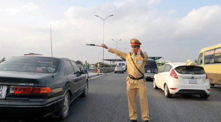 | Cảnh sát giao thông phân làn giao thông trên cao tốc Pháp Vân - Cầu Giẽ - Ảnh: Hoàng Anh |