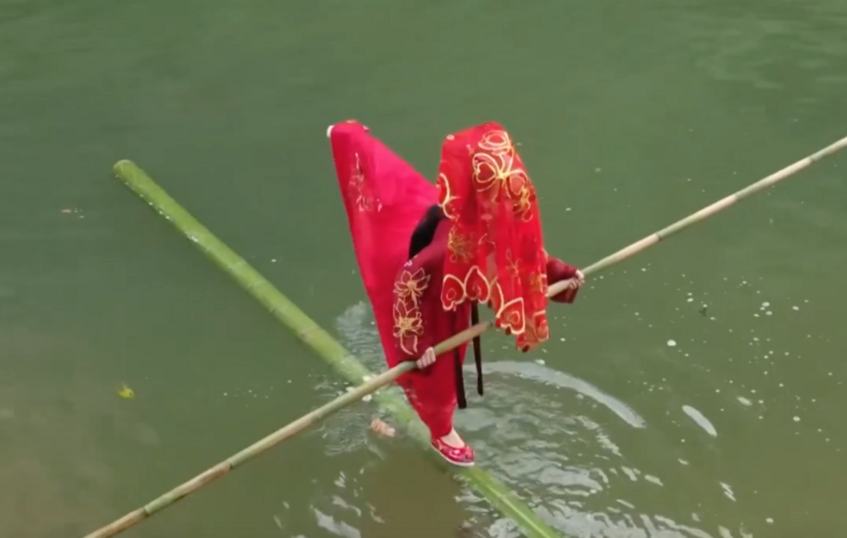 Với kỹ năng múa điêu luyện, một nghệ sĩ múa tại Trung Quốc có thể biểu diễn các động tác uyển chuyển khi đứng trên một sào tre nổi trên sông.