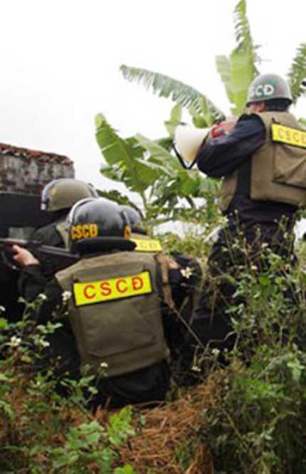 Đến 12h cùng ngày, lực lượng công an đã phải sử dụng biện pháp mạnh, bắn lựu đạn cay vào ngôi nhà rồi lập tức áp sát xông vào bên trong. Tuy nhiên, lúc này, các đối tượng đã bỏ trốn qua khu vực rừng phòng hộ ở ngay sát cạnh ngôi nhà. Lực lượng công an đã thu giữ 1 số bình ga, vỏ kíp nổ, bình ắ́c quy, dây điện là phương tiện gây nổ.