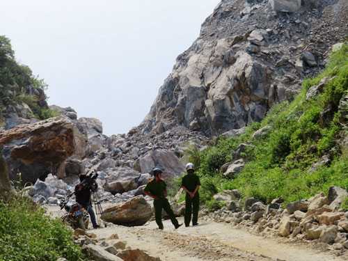 | Đường vào khu mỏ đá vẫn bị cơ quan chức năng phong tỏa để phục vụ điều tra. Ảnh: Giang Chinh. |