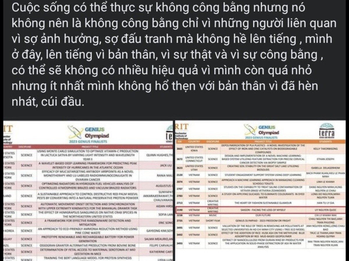 Ngày 6/7, tài khoản Facebook có tên M.C (cựu học sinh Trường THCS Lê Văn Tám, quận Bình Thạnh, TP.HCM), chia sẻ, tham gia cuộc thi Genius Olympiad 2023 diễn ra tại Mỹ, ngoài đề án âm nhạc, M.C còn có đề án viết.