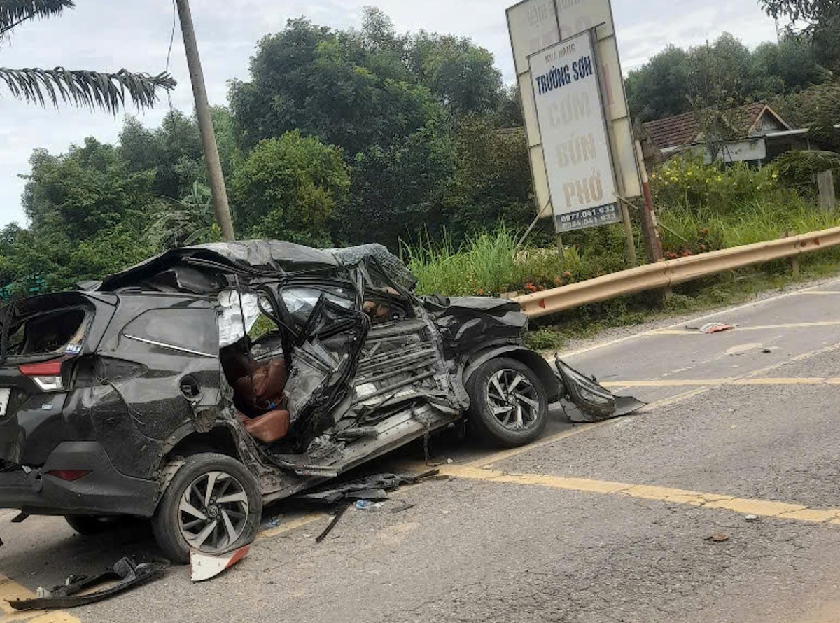 Chiếc ô tô con chở 4 người bị vò nát sau cú va chạm với xe đầu kéo trên đường Hồ Chí Minh đoạn qua tỉnh Quảng Trị.