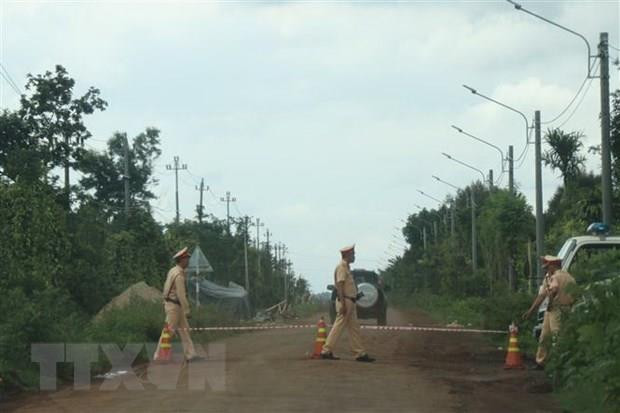 Lực lượng chức năng chốt chặn đường vào Ủy ban Nhân dân xã Ea Ktur, huyện Cư Kuin phục vụ truy bắt nhóm đối tượng. (Ảnh: Tuấn Anh/TTXVN).