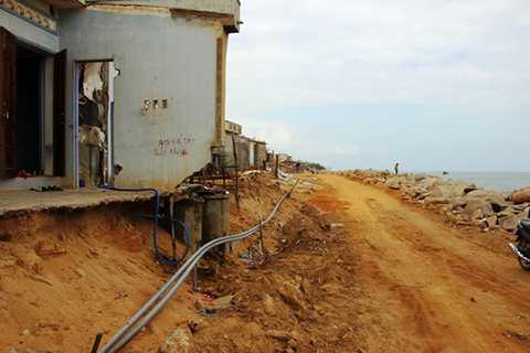Những ngày qua, về đêm xuất hiện nhiều đợt sóng cao khoảng 3 m đánh mạnh vào bờ biển làm 20 hộ dân tại đây phải chống chọi lại tình trạng sạt lở bờ biển.Ông Ba Huân, 45 tuổi, buồn bã: “Có nhà nhưng không được ở nhiều, tối sang nhà ngươi thân ở tạm, sợ nước tràn vào bất ngờ”. |
