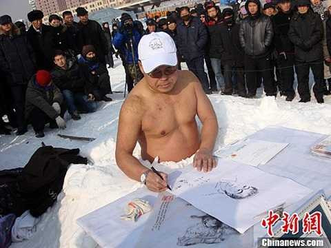Chưa dừng lại ở đó, chàng trai này tiếp tục gây sốc khi tới Cáp Nhĩ Tân biểu diễn màn tắm nước lạnh giữa thời tiết lạnh thấu xương -30 độ C.