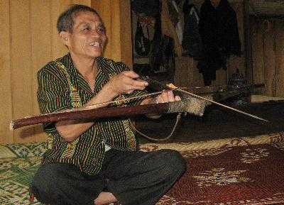 | Già làng Cơlâu Blao với dụng cụ săn bắn của người Cơ Tu |
