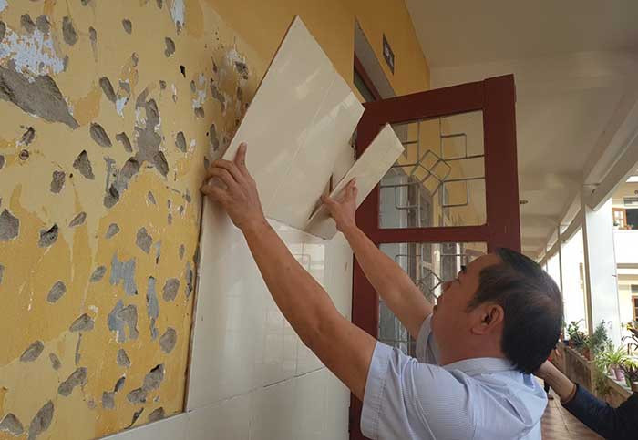 Những tấm gạch sau một năm gia cố lại, chạm nhẹ tay đã bong toác