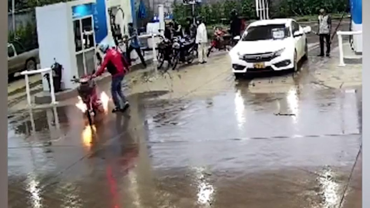 Người đàn ông tại Viêng Chăn, Lào khởi động xe máy sau khi vừa đổ xăng bất ngờ ngọn lửa bùng phát dữ dội, nhân viên trạm xăng nhanh chóng hỗ trợ dập lửa.