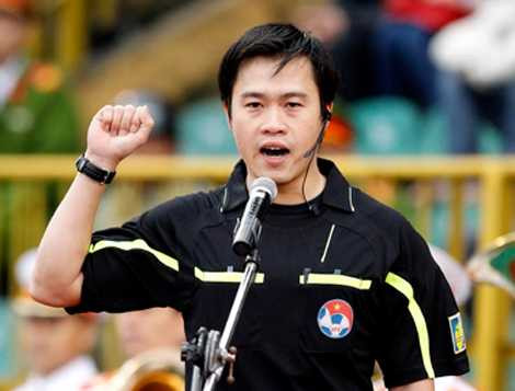| Trọng tài Đinh Hải Dương tuyên thệ ở trận đấu đầu tiên của V-League 2013 (Ảnh: Tuổi trẻ) |