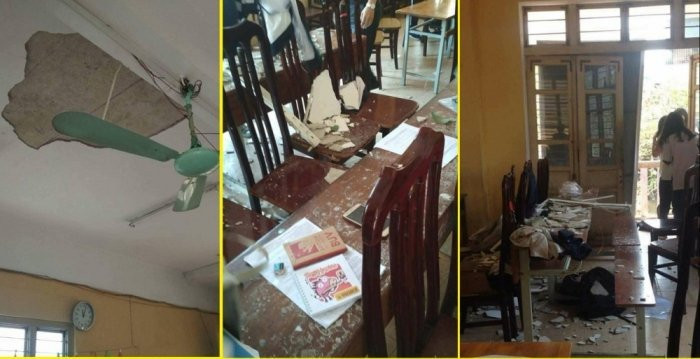 Khi các bạn học sinh lớp 12A2 đang ngồi trong phòng học thì một mảng vữa lớn rơi từ trên trần nhà rơi xuống chỗ nhiều bạn học sinh đang ngồi học.