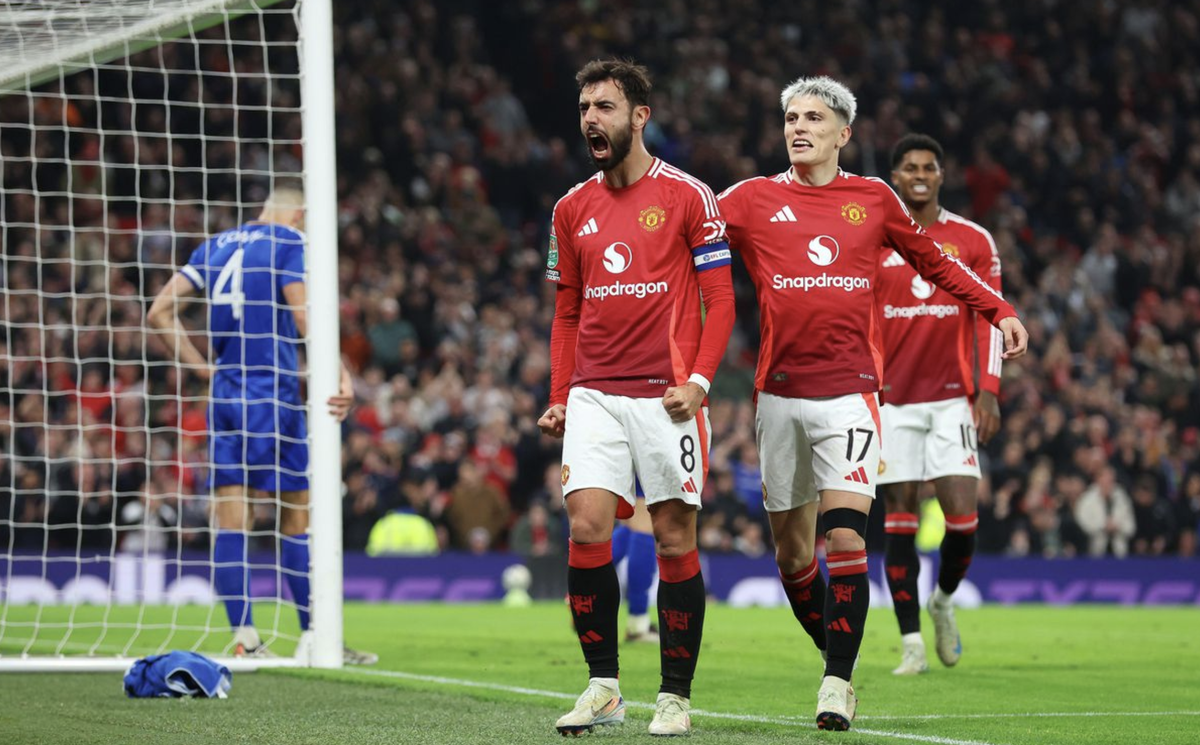 Man Utd có thêm 2 bàn thắng trong hiệp 1, với lần lượt người lập công là Bruno Fernandes và Casemiro. Bruno ghi bàn đầu tiên ở mùa 2024-25 sau cú đá phạt hàng rào ở phút 36. Bóng đập trúng người hậu vệ James Justin đổi hướng, nhưng bàn thắng vẫn được tính cho đội trưởng Man Utd.