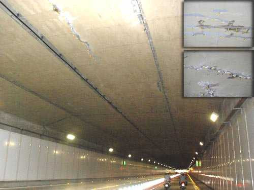 | Một số vết trám bằng keo trên trần hầm vượt sông Sài Gòn. |
