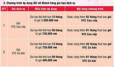 Đối với các khách hàng thân thiết, lâu năm và hiện vẫn đang sử dụng các dịch vụ truyền hình của VTC, khi đăng ký gia hạn thẻ thời hạn 12 tháng sẽ được hưởng ngay ưu đãi tặng thêm 02 tháng miễn phí gói VTC tương ứng, và khi đăng ký gia hạn thẻ thời hạn 6 tháng sẽ được hưởng ngay ưu đãi tặng thêm 01 tháng miễn phí gói VTC tương ứng
