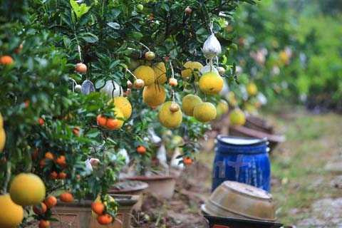 | Ông Giáp cho biết, cây chọn ghép phải có thân to và bộ rễ chùm khỏe, thường là cây bưởi, sau đó đưa thêm các loại quả khác như cam, phật thủ,… sao cho các loại quả chín đúng dịp Tết. (Ảnh: Minh Sơn/Vietnam+) |