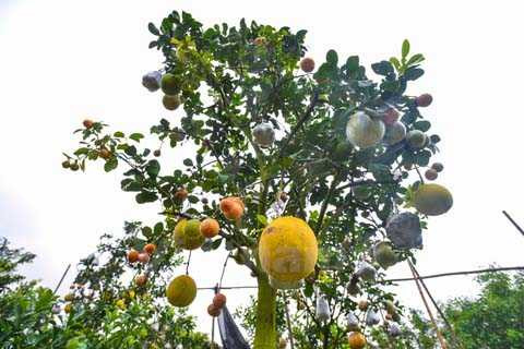 | Một cây ghép quả cỡ lớn, có đủ 10 loại sẽ có tới gần 100 quả trên thân chính. Ngoài ra, mỗi cây ghép ngoài quả đã lớn còn có đầy đủ chồi, lộc, quả non và hoa chanh, bưởi, cam tỏa hương thơm ngào ngạt. (Ảnh: Minh Sơn/Vietnam+) |