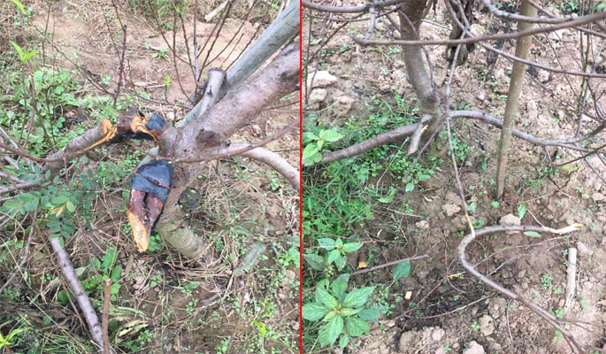 Theo anh Kiên, gia đình anh trồng hơn 8 sào cây đào (đào xương chưa ra hoa) để bán cho khách buôn mang về chăm sóc bán đợt Tết. Tuy nhiên, đến sáng 9/1, khi anh Kiên ra vườn thì phát hiện 20 gốc đào bị chặt, chém đoạn gốc, ngọn, thân cây.