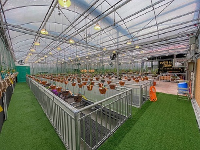 Vườn lan của anh Cường rộng khoảng 400m2, gồm nhiều loại hoa lan khác nhau đến từ mọi vùng miền của đất nước. Để gây dựng khu vườn như hiện nay, chàng nghệ nhân trẻ phải đầu tư nhiều tiền bạc, thời gian, công sức. Anh muốn khu vườn phong lan của mình không chỉ phong phú nhiều chủng loại mà còn phải đẹp mắt, tinh tế. Vì vậy, chàng trai trẻ chi khoản lớn để lắp đặt hệ thống chiếu sáng, thảm cỏ xanh, khung thép đồng bộ.