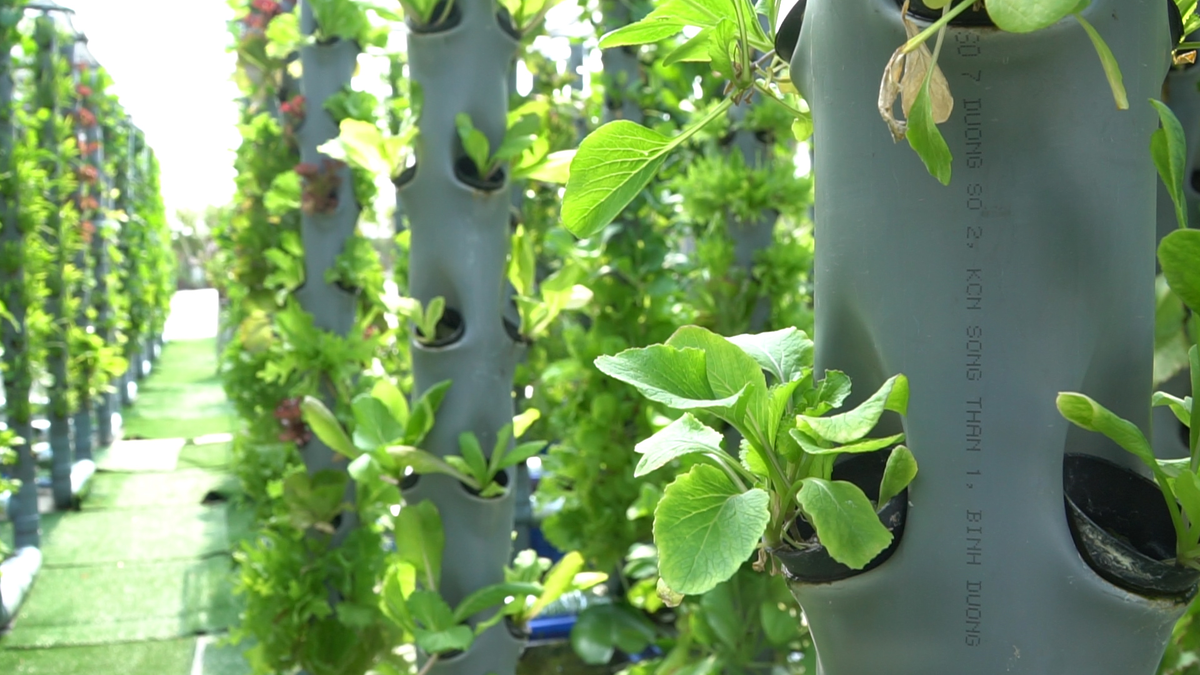 Anh Nguyễn Hòa (Bình Tân, TP.HCM) tận dụng không gian trên sân thượng để trồng rau sạch trong các trụ nhựa thẳng đứng, theo phương pháp khí canh hữu cơ.