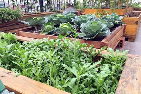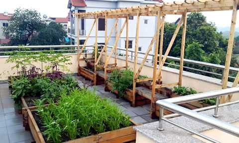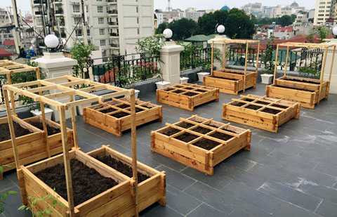 Rau được gia chủ trồng trong 12 chiếc thùng gỗ, mỗi chiếc thùng rộng chừng 1m2, được bào nhẵn không một vết sần sùi. Bốn thùng được thiết kế thiểu kiểu nhiều tầng, chỗ cao có thể trồng cây lâu năm, cây ăn củ.