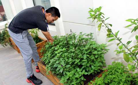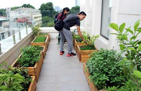 Do yêu thích làm vườn, cô chủ này cũng đầu tư thuê hẳn một công ty chuyên làm vườn cao cấp tới lắp đặt khu vườn chừng 30m2 trên tầng 5, tại khách sạn do cô chủ kinh doanh, để chuyên trồng rau gia vị. Tại đây đặt hơn 10 hộp gỗ, mỗi hộp giá từ 500.000 tới 1,5 triệu đồng, để trồng các loại rau húng láng, quế tây, tía tô, rau mùi, bạc hà,... Các loại rau này được chăm sóc thủ công và chỉ phục vụ cho các khách hàng của khách sạn.