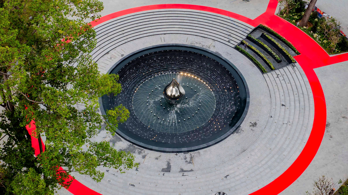 Tượng đài Giọt nước cao 6m, chu vi 13m, được chế tác từ inox gương. Bên trong giọt nước là hình ảnh trái tim – biểu tượng của sự tri ân, tình yêu thương. Bao quanh tượng đài là 9 bậc cấp và 360 ngọn nến nước.