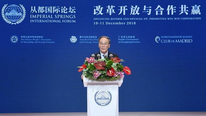 Ông Vương Kỳ Sơn nói Bắc Kinh sẽ kiên định với "tập trung chiến lược" và sẽ không từ bỏ mô hình kinh tế của nước này trong bối cảnh Trung Quốc đang đối diện với môi trường bên ngoài ngày càng thù địch vì cuộc chiến thương mại với Mỹ.