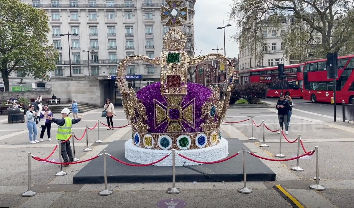 Một chiếc vương miện khổng lồ đã được đặt tại cổng vòm đá Marble Arch, London, để chuẩn bị cho lễ đăng quang của Vua Charles III.