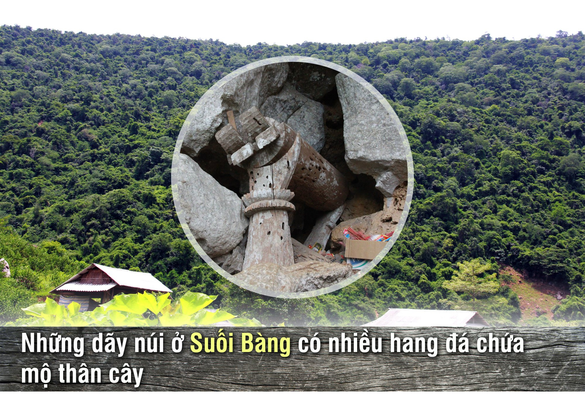 Anh Đinh Văn Sửu, Bí thư Đảng ủy xã Suối Bàng dẫn tôi ra giữa sân trụ sở trong cái nắng chói chang ngày hè, chỉ những vách đá dựng đứng, với những cái hang mà nhìn từ xa như hang chuột và bảo rằng trong hang có rất nhiều mộ thân cây chứa xương cốt. Anh Sửu bảo, đứng ở trung tâm xã, nhìn thấy hang đá hiện ra giữa vách đá trắng hếu xen lẫn thảm xanh đại ngàn, nhưng để đến được vách đá ấy, phải mất nửa ngày đi bộ. Hang gần nhất, thì cũng phải mất chừng tiếng đồng hồ leo núi, xuyên rừng.