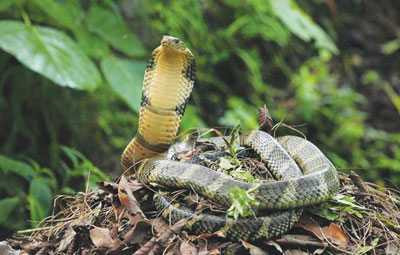 | Một đôi rắn hổ mang chúa tại khu vực núi đất Phong Nha - Kẻ Bàng. Đây là loài rắn cực kỳ quý hiếm bởi chúng bị săn lùng ráo riết. |